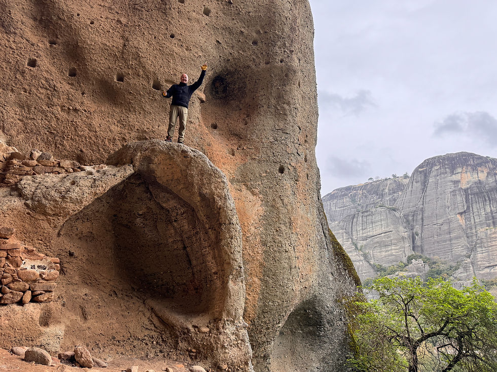 Es sind oftmals die alten Pfade der Mönche. Einer der Vorteile, anfangs Jahr in Meteora zu sein ist, dass die Bäume und Büsche noch nicht im Laub stehen, so sieht man sehr viel mehr von den Wänden, Ruinen und Klöstern. Die Nässe stört nicht, sie verteilt sich gleichmässig, innen vom Schwitzen und aussen vom Regen.